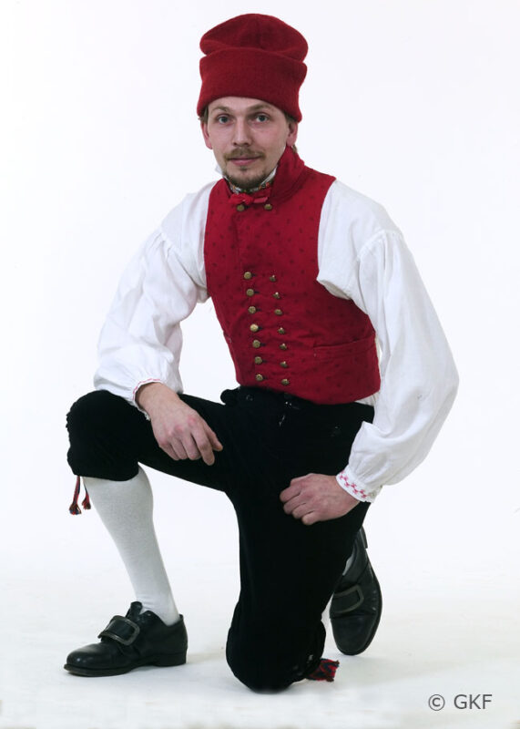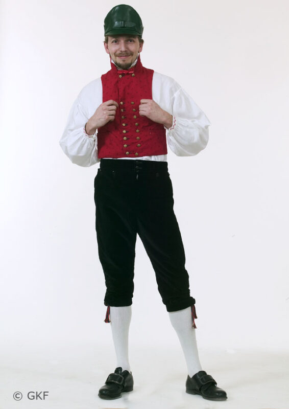 Mansdräkt för finare kyrkobruk eller annandagar bars med ytterplagg och huvudbonad. Vit linneskjorta med broderier och ett halskläde av siden. En väst av kattun med mässingsknappar. Knäbyxor som kunde vara av finare slag, av vadmal, kläde eller skinn. Vita yllestrumpor med plockade strumpeband och svarta skor med spännen. På huvudet en skinnkaskett eller en röd stickad mössa.