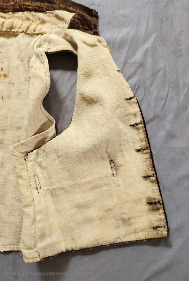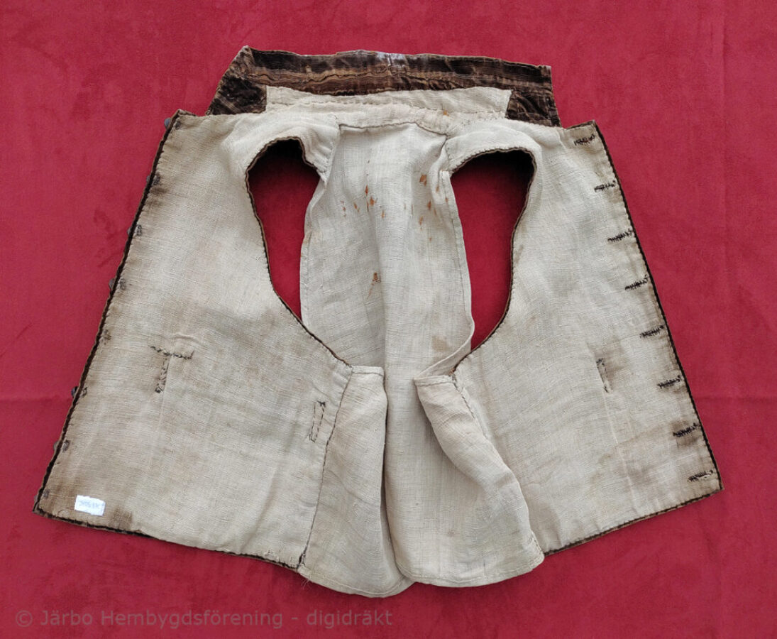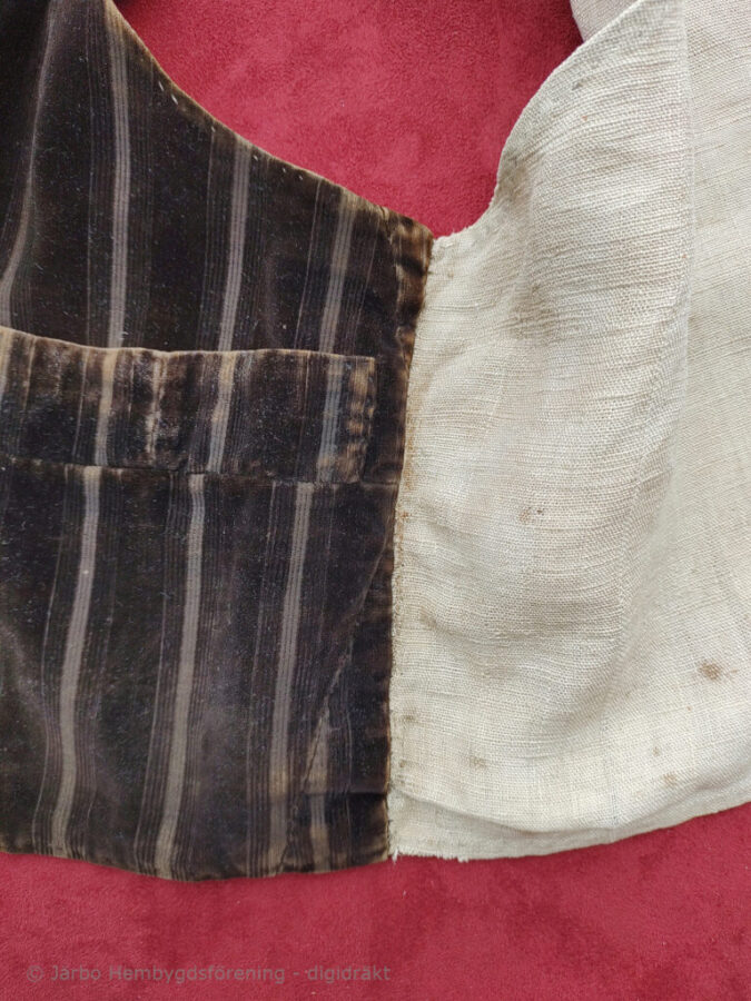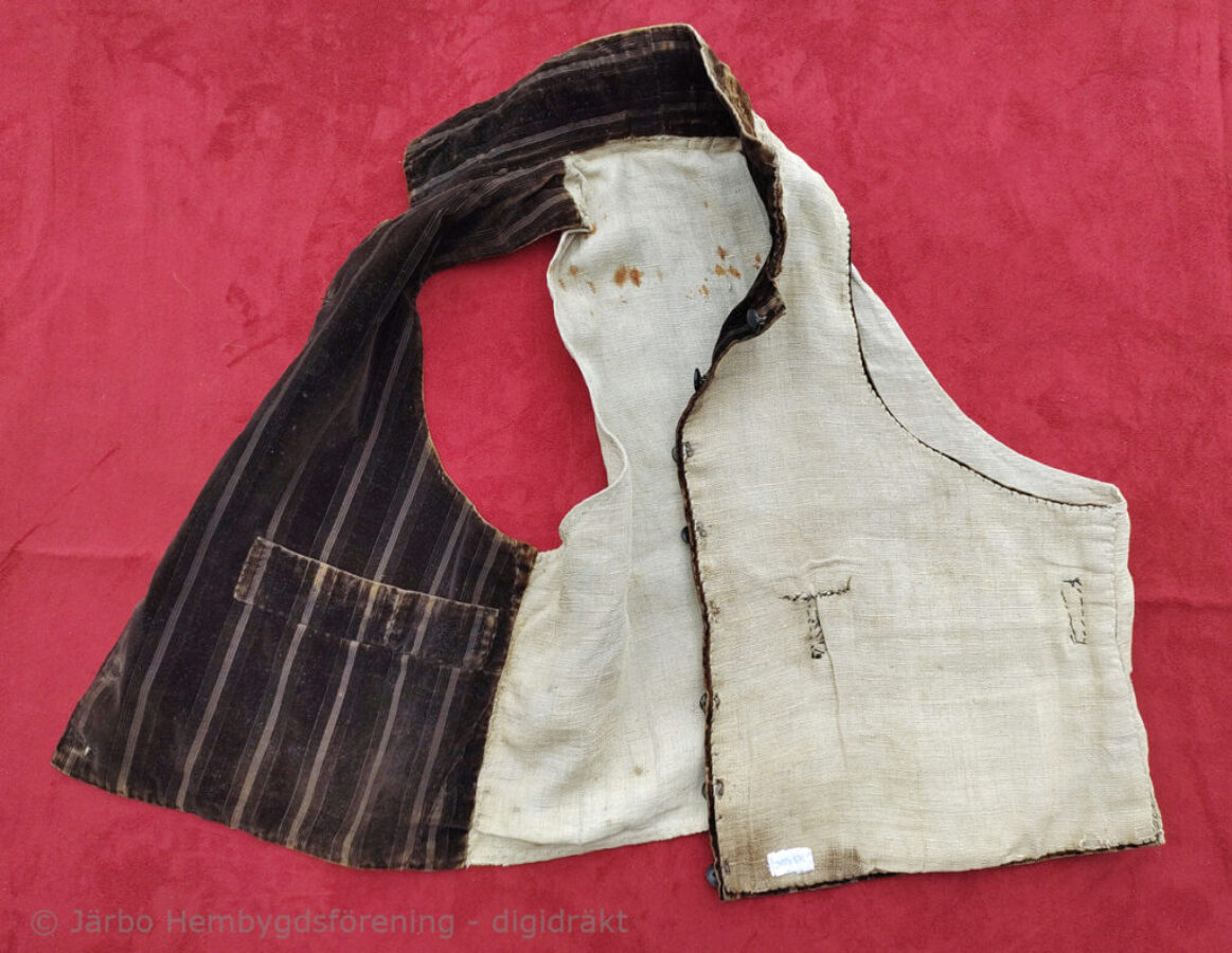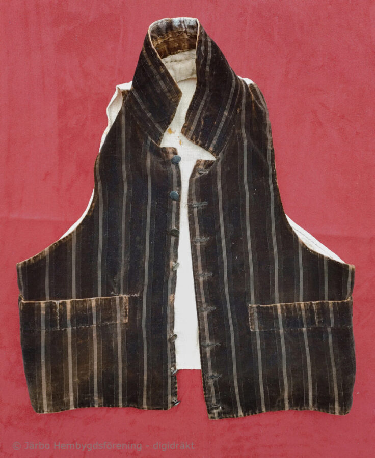 Bergsmansväst av svart sammet med skurna mönster, fodrad med linne. Knäpps med en enkel knapprad med 8 svarta knappar. Västen har ej yttertyg i ryggen och har alltså alltid burits med rock eller jacka över. Denna användes tillsammans med svarta sammetsbyxor.