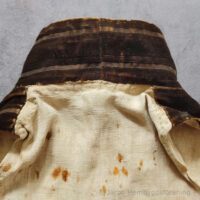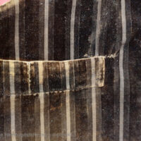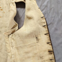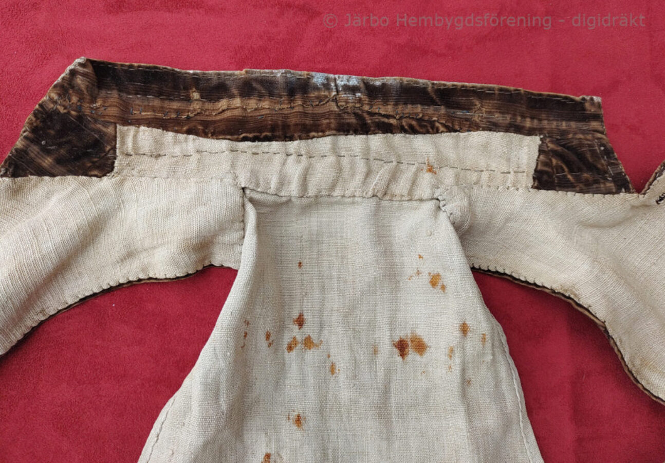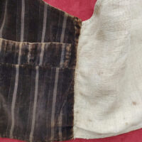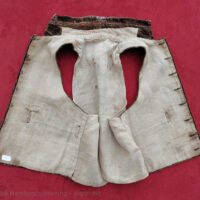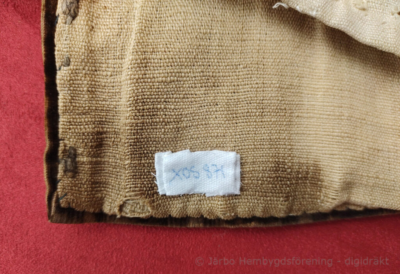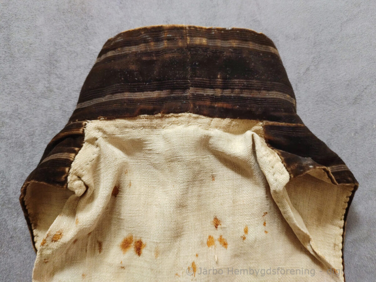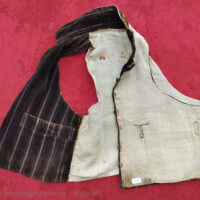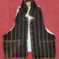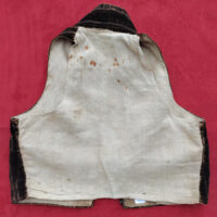 Bergsmansväst av svart sammet med skurna mönster, fodrad med linne. Knäpps med en enkel knapprad med 8 svarta knappar. Västen har ej yttertyg i ryggen och har alltså alltid burits med rock eller jacka över. Denna användes tillsammans med svarta sammetsbyxor.