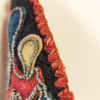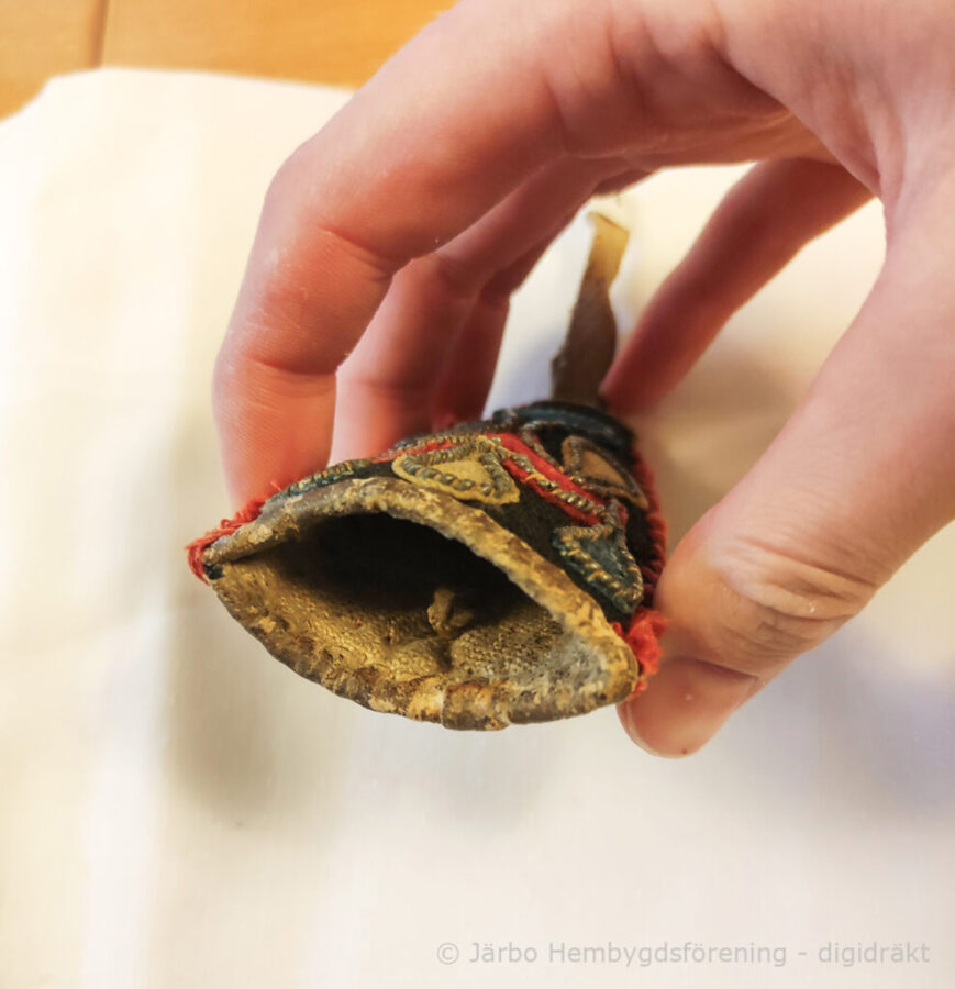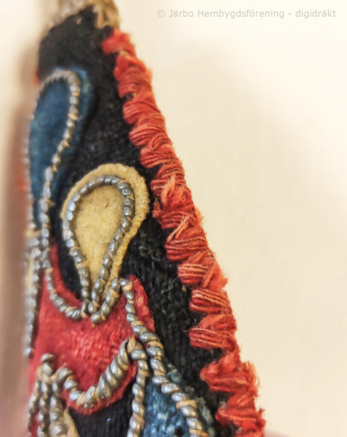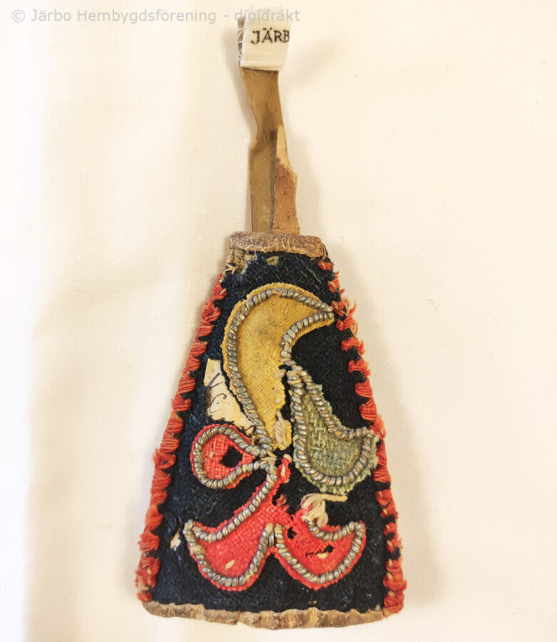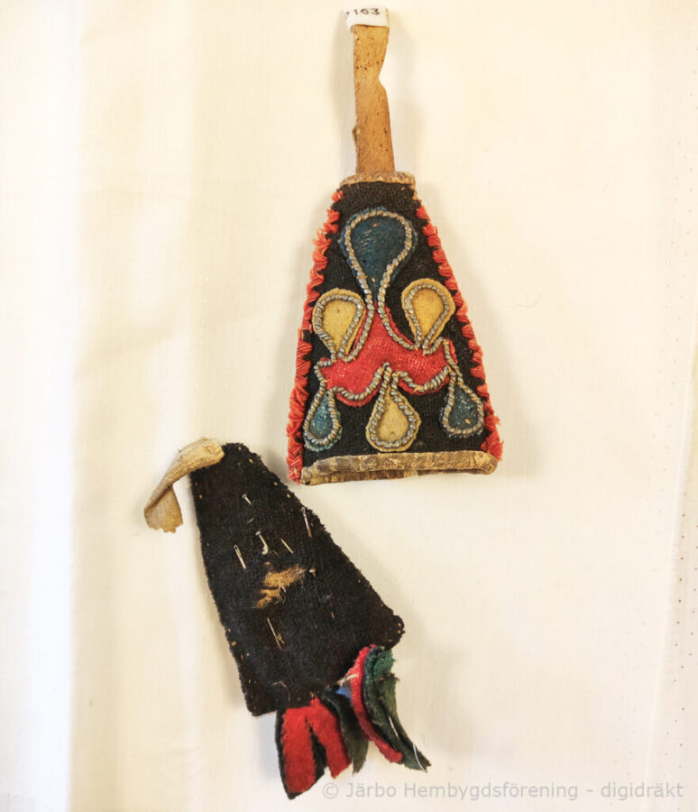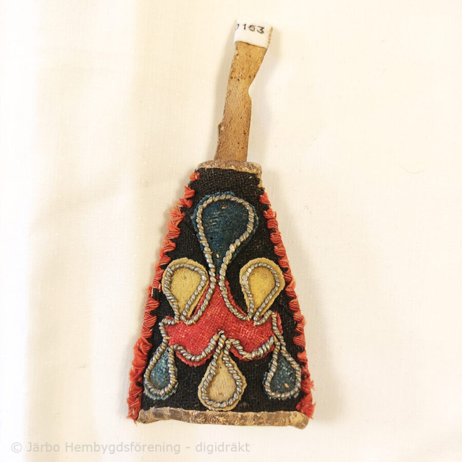 Ett nålhus av kläde med applikationer och tenntrådsbroderi. Nålhuset hängdes på ett livband runt midjan. Inuti nålhuset finns en liten nåldyna.