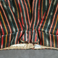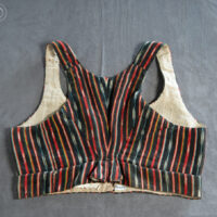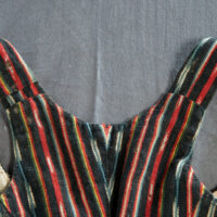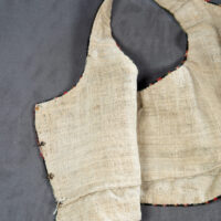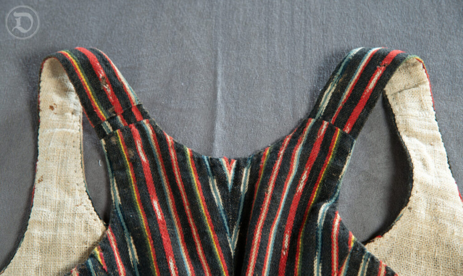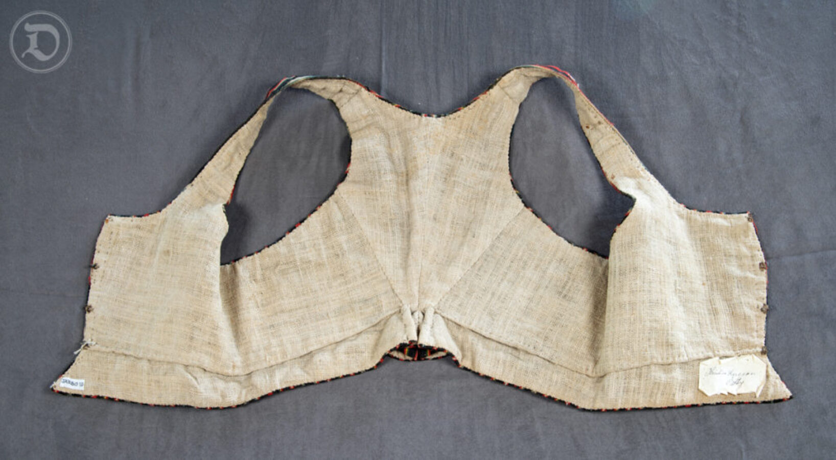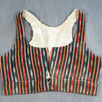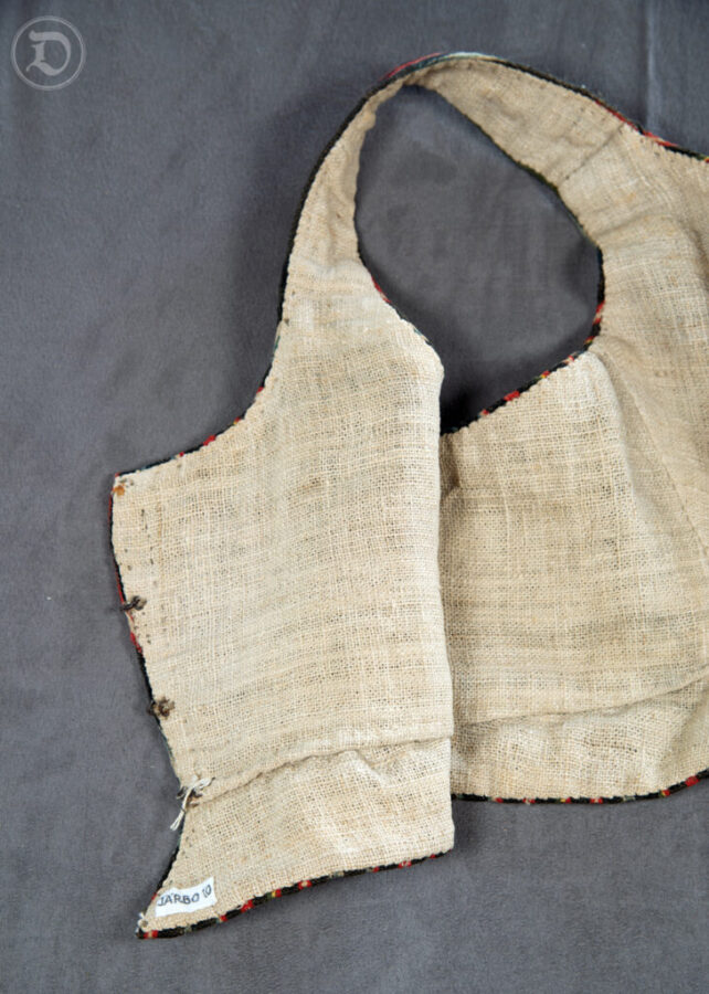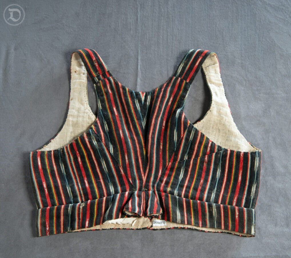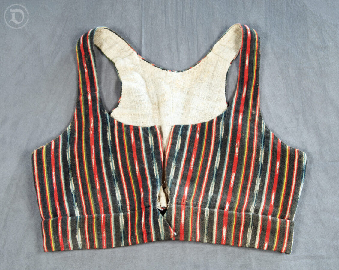 Ett randigt skunklivstycke med små skört bak. Av randig pärk med flamgarnseffekt, fodrat med oblekt linne. Knäpps med hyskor och hakar framtill.