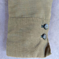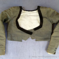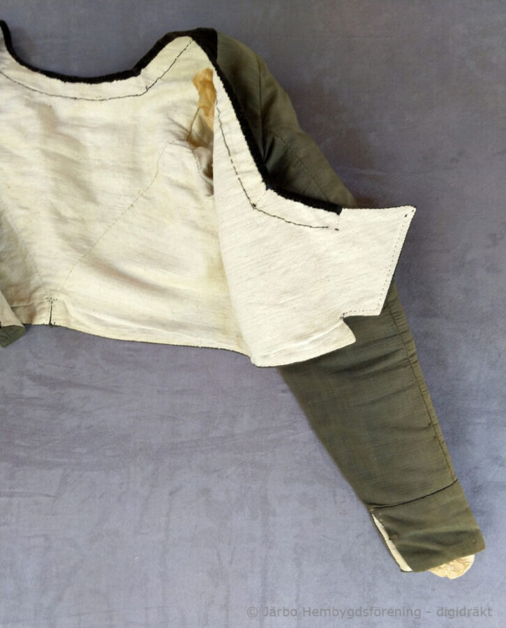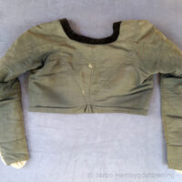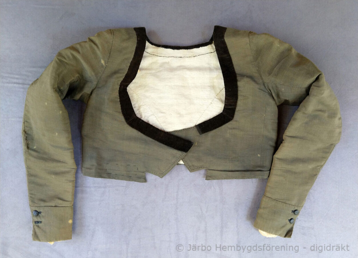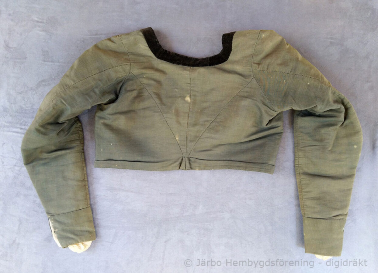Svart tröja i empirmodell av kamlott – ett tuskaftsvävt tyg av ull/mohair, tätt slaget med en härlig stelhet och glans. Halslinningen är kantad med svart bomullssammet och tröjan är fodrad med oblekt linne. Korta skört baktill i ryggen. Denna har burits ihop med den svarta kyrkkjolen som kyrkplagg på alla ”dagar” vintertid, – jul, annandagar och vid sorg/begravning.