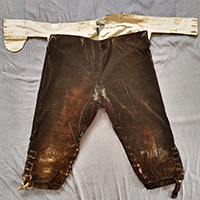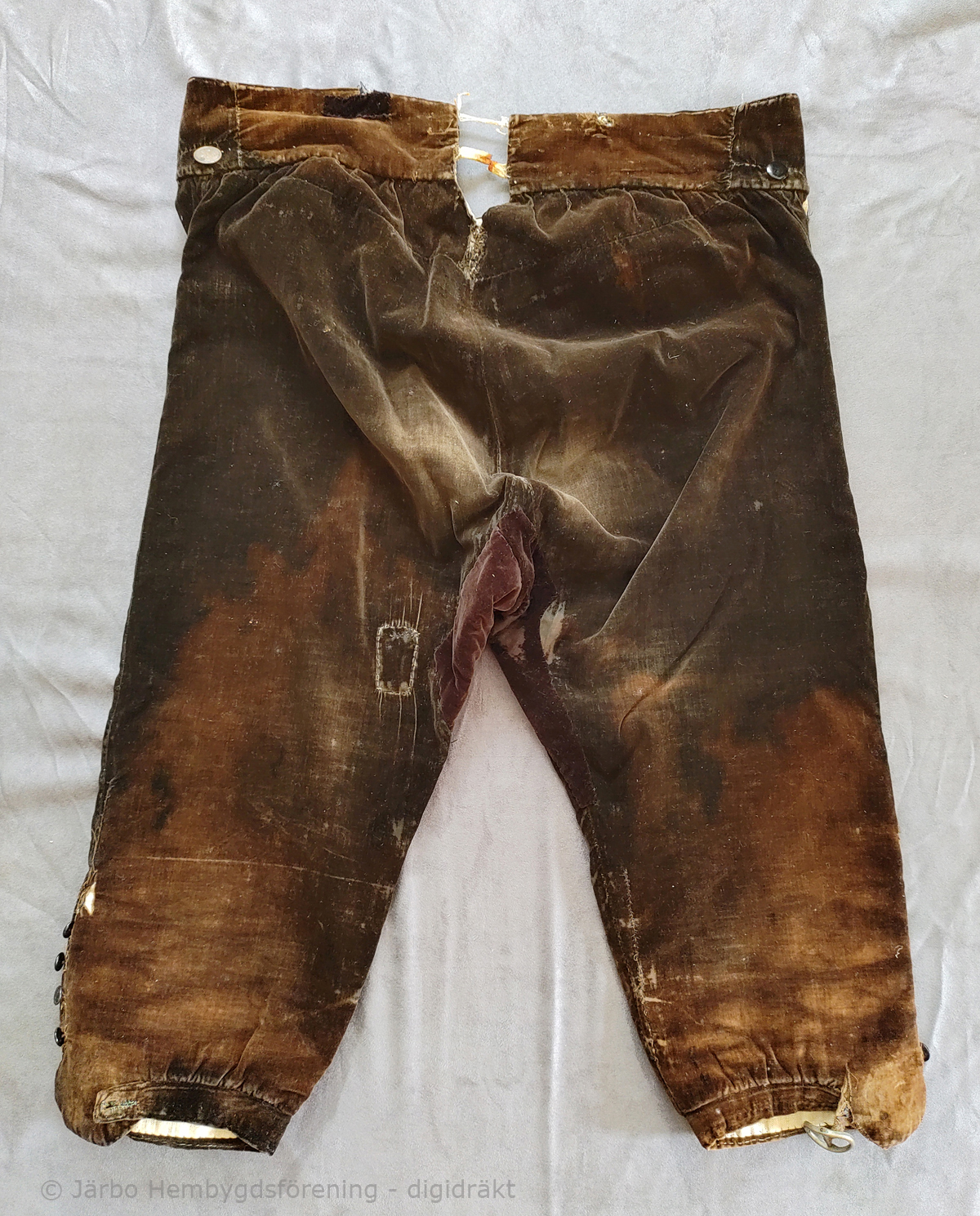 Knäbyxor i svart sammet, användes tillsammans med randig väst. Orginalet finns på Ovansjö Hembygdsgård.