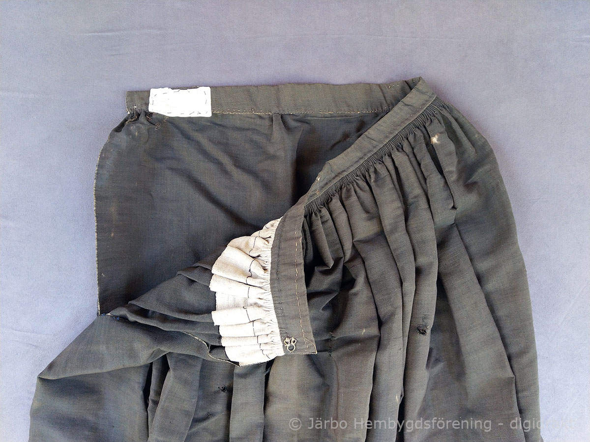 En svart kjol av kamlott - ett tuskaftsvävt tyg av ull/mohair, tätt slaget med en härlig stelhet och glans. Dessa har burits på alla "dagar", pingst-, jul etc, samt på annandagar och vid sorg/begravning. Den svarta kjolen har endast varit ett kyrkplagg. Till just denna kjol finns en tillhörande tröja av samma tyg. Linningen och rynkdelen är fodrat med oblekt linne, fållen nedtill är skodd med domestik - ett lite enklare brunt bomullstyg. Originalet finns i Järbo Hembygdsförenings textilarkiv.