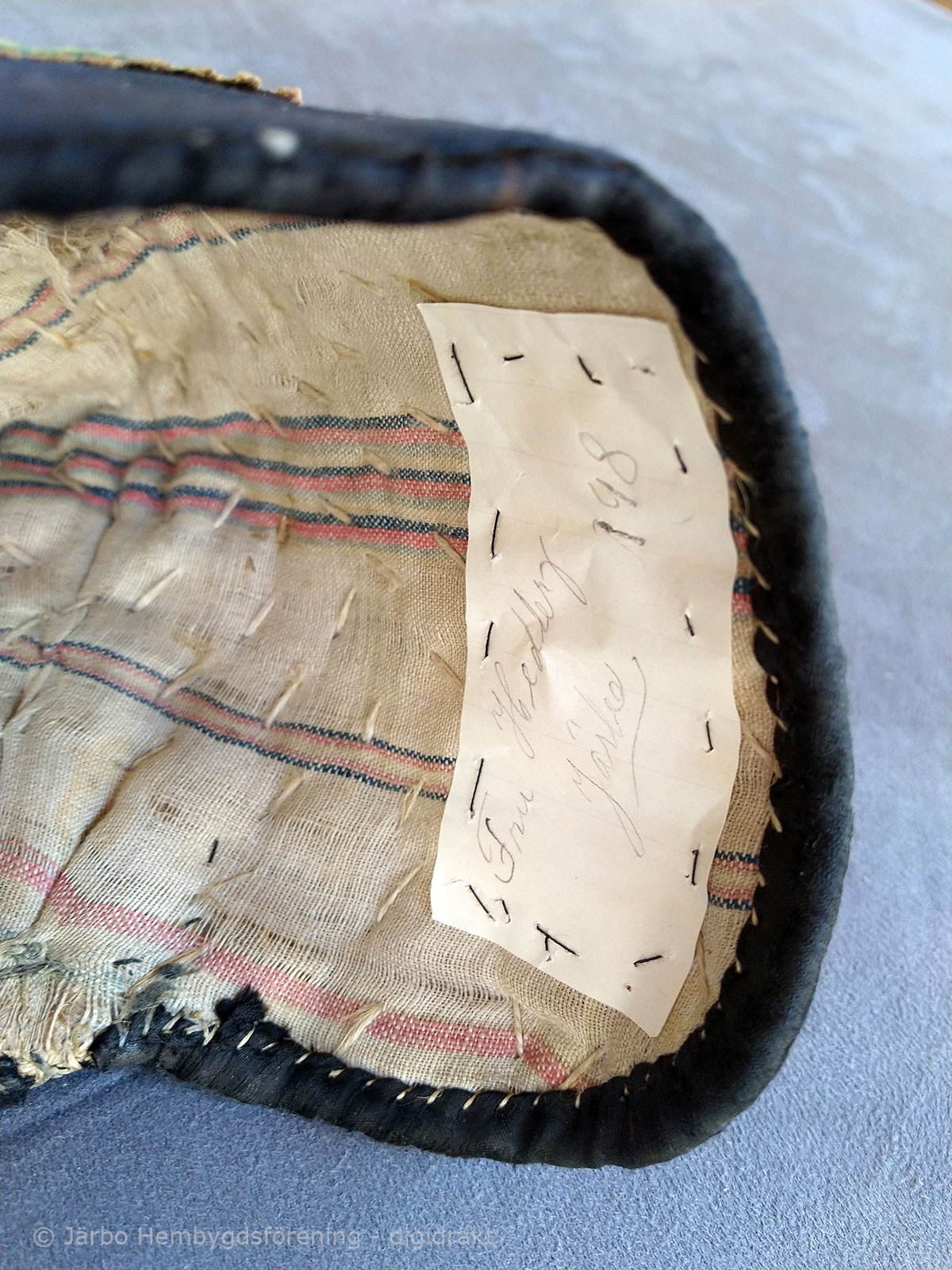 Svart skarpmössa användes till kyrkbruk. Till vardags användes enklare bindmössor i olika färger, alltid med stycke under. Originalet finns i Järbo Hembygdsförenings textilarkiv.